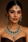 QueenAura™ Royal Emerald American CZ Diamond Necklace Set for Women | Premium Silver-Coated Stainless Jewelry with Maangtika & Earrings